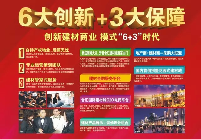 值得一提的是合匯建材城最大的亮點是“6大創(chuàng)新+3大保障”的創(chuàng)新建材“6+3”商業(yè)模式,不但讓客戶來到這里有生意做,還有經(jīng)營保障;另合匯地產(chǎn)集團建材工程招標將與建材城商戶建立采購聯(lián)盟,所謂“肥水不流外田”啊!